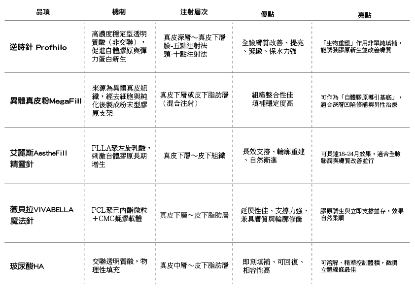 玻尿酸填補、微晶瓷填補、安提斯填補、肉毒桿菌除皺拉提、埋線拉皮回春、舒顏萃液態拉提、自體生長因子回春等。